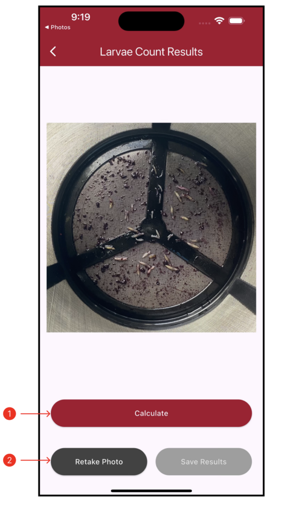 - Within seconds, results will appear highlighting identified 2nd and 3rd instar larvae along with the total count.