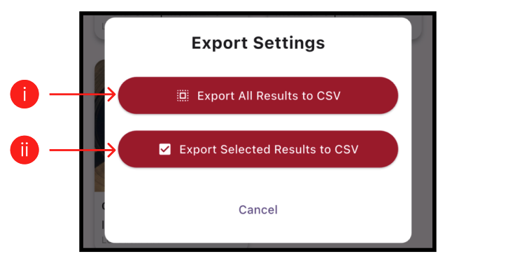 - Export Selected Results to CSV Allows users to handpick specific images/results to be included in the export file. Use the checkboxes next to each result to make your selection before exporting.